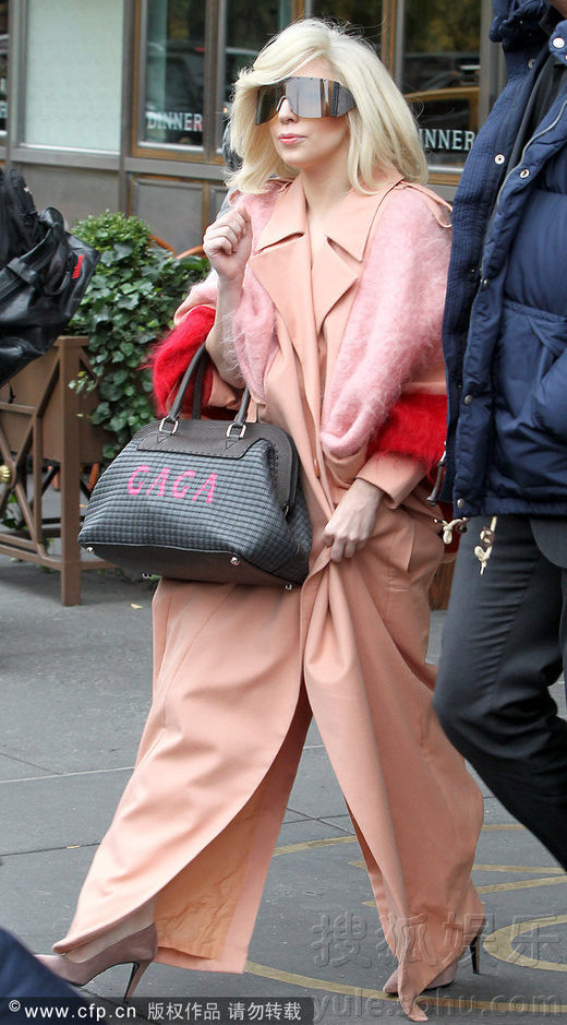 2013年11月13日讯,纽约,当地时间11月12日,Lady Gaga身穿嫩粉色色长风衣外出秀美腿,前卫黑超搭专属手袋个性十足。